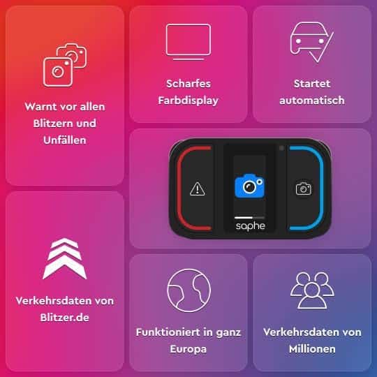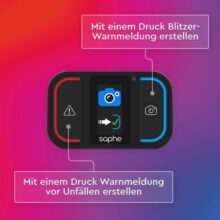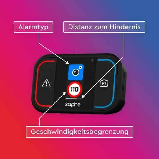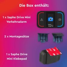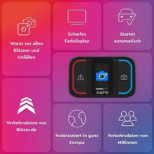 It warns of stationary and mobile speed cameras as well as accidents and other hazards. The data comes from a community of over one million users and from partners such as Blitzer.de. The Saphe Drive Pro starts automatically when you start driving and connects to the Saphe Link app on your smartphone via Bluetooth.
